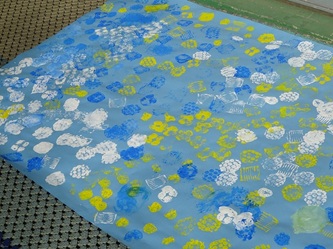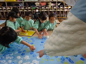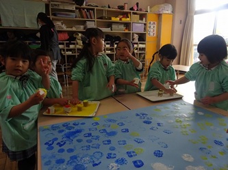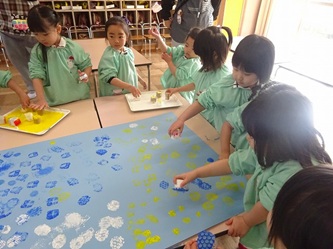 大きな水色の紙に、いろいろな形のスタンプで、様々な色をつけて、楽しんでいました!