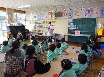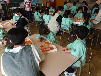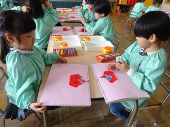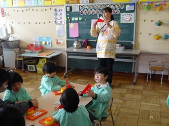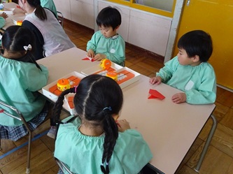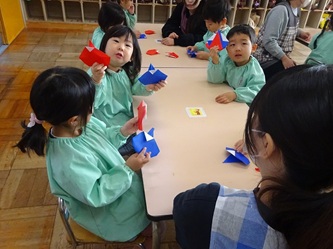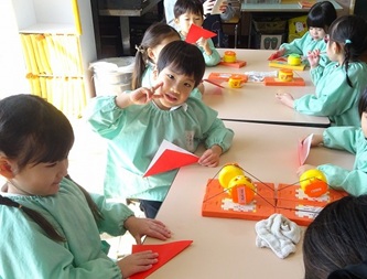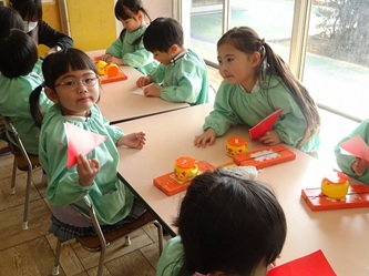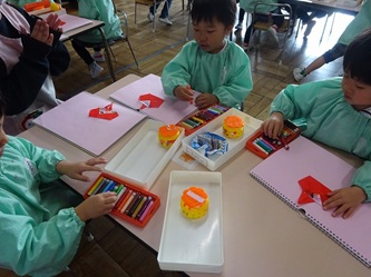 先生の話をよく聞いて、2月節分のちなんで、折り紙で「鬼」を一生懸命に折っていました!