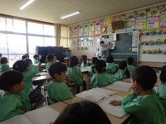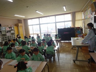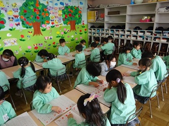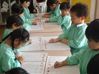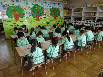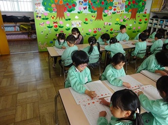 年中さんの部屋では、ワークを使って、ひらがなの「こ」と「に」を書いていました。みんなで「こ」がつく名前などを発表し合っていました。