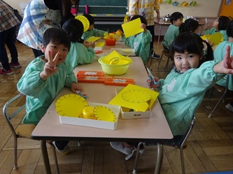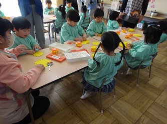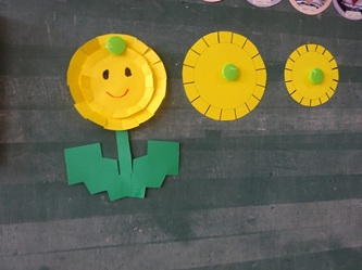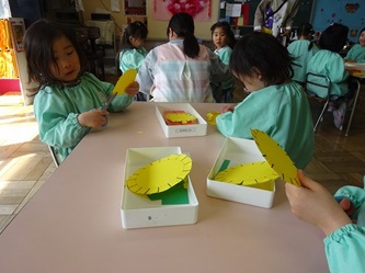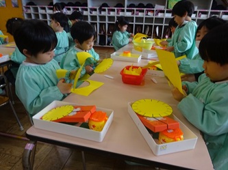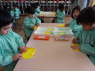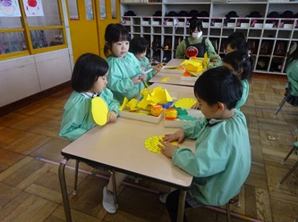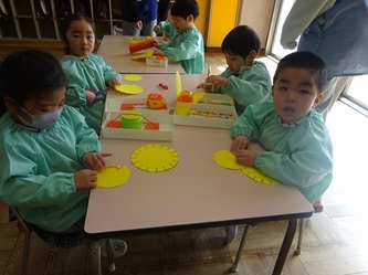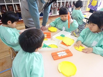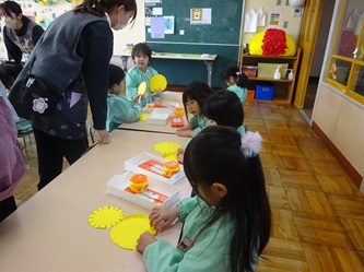 年少さんの部屋では、壁面の作品作りで「たんぽぽ」を作っていました。