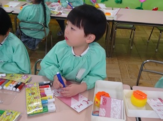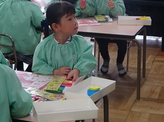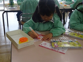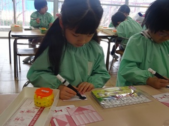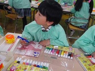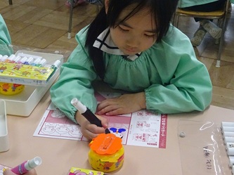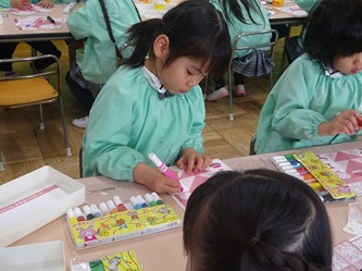 年中さんの部屋では、サインペンを使って、「ひな祭り」のぬり絵をしていました!