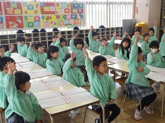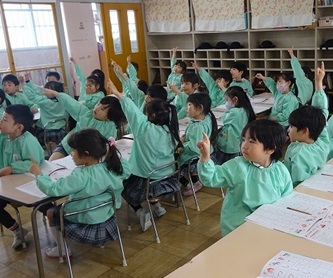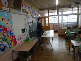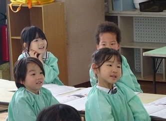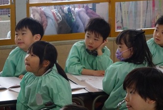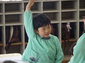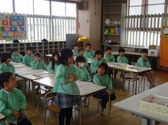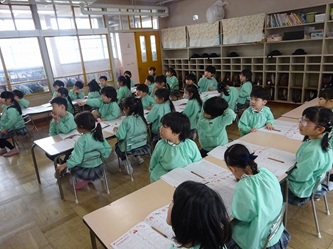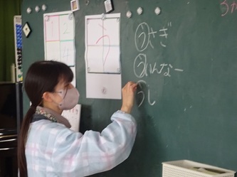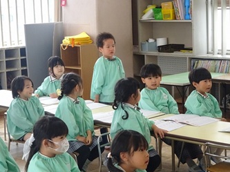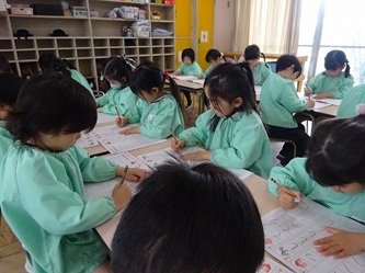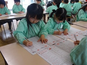 今日は、卒園した年長さんの青組、黄組の部屋に、それぞれ水組、緑組の子どもたちが入って、「ひらがな」を書いていました!「う」「て」の字について、みんなでいろいろ考えていました。「う」のつく言葉を発表したり、それぞれの字の書き方を確認したりして、字を書いていました。