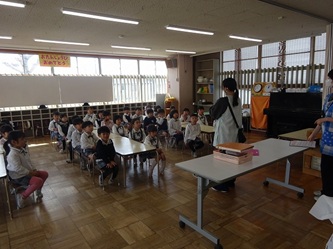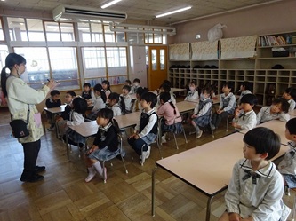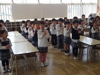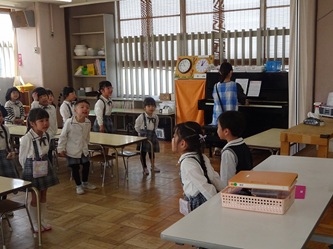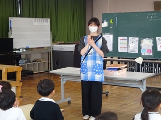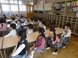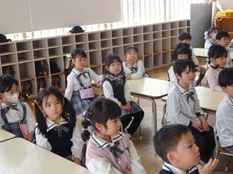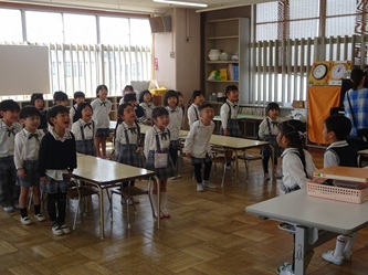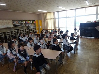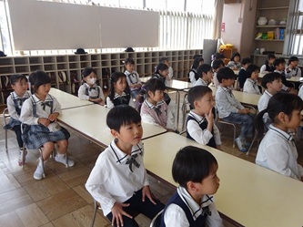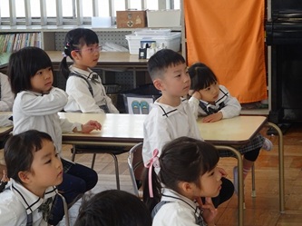子どもたちは、年長では日直を二人で行ったり、給食前に机を自分たちで拭いたりするなどの話を、真剣に聞いていました。